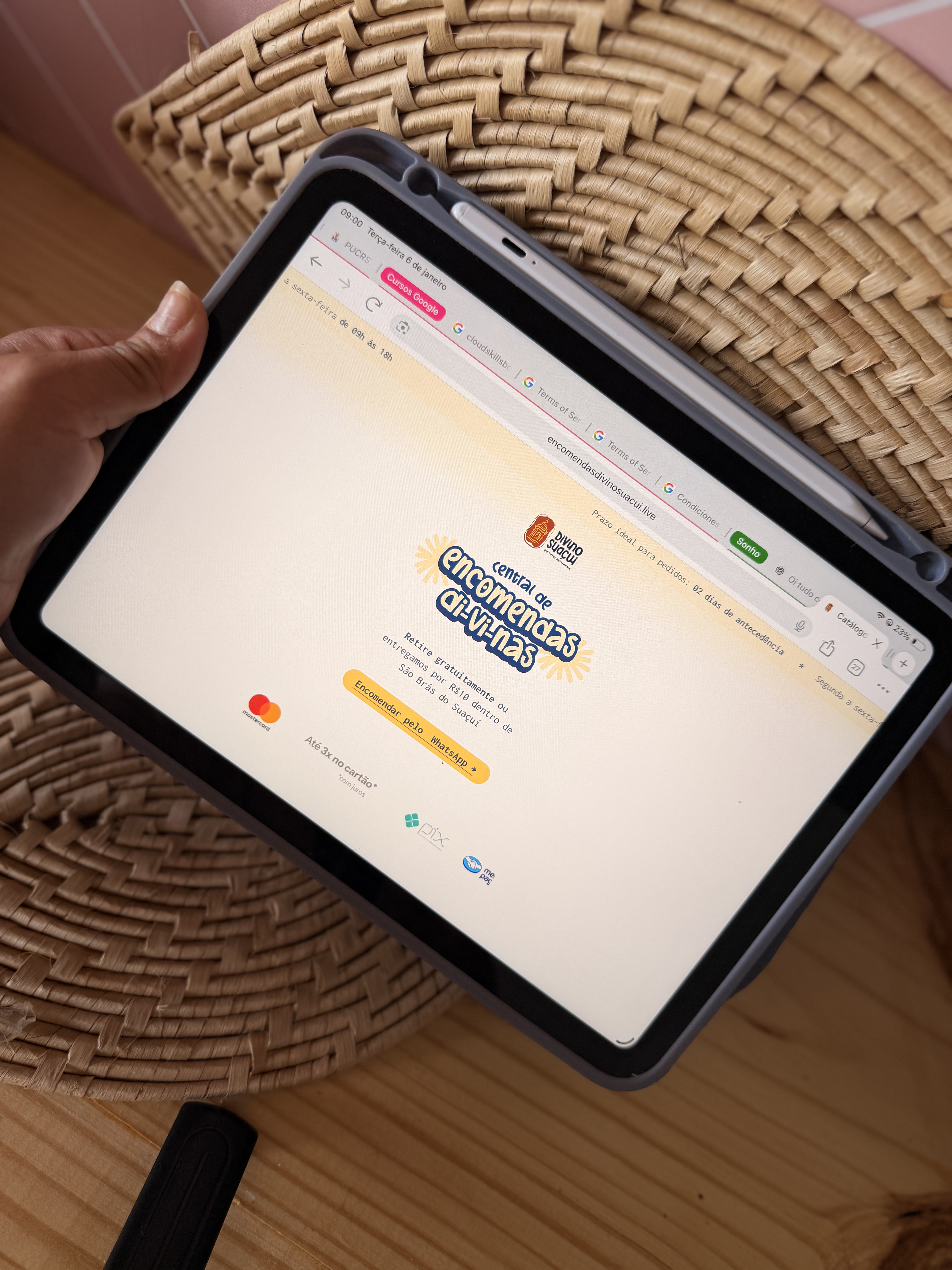 Projetei a "Central de Encomendas Di-vi-nas" utilizando o Figma Sites. A escolha técnica visou a agilidade de um MVP (Minimum Viable Product) sem custos de infraestrutura complexa, focando em: