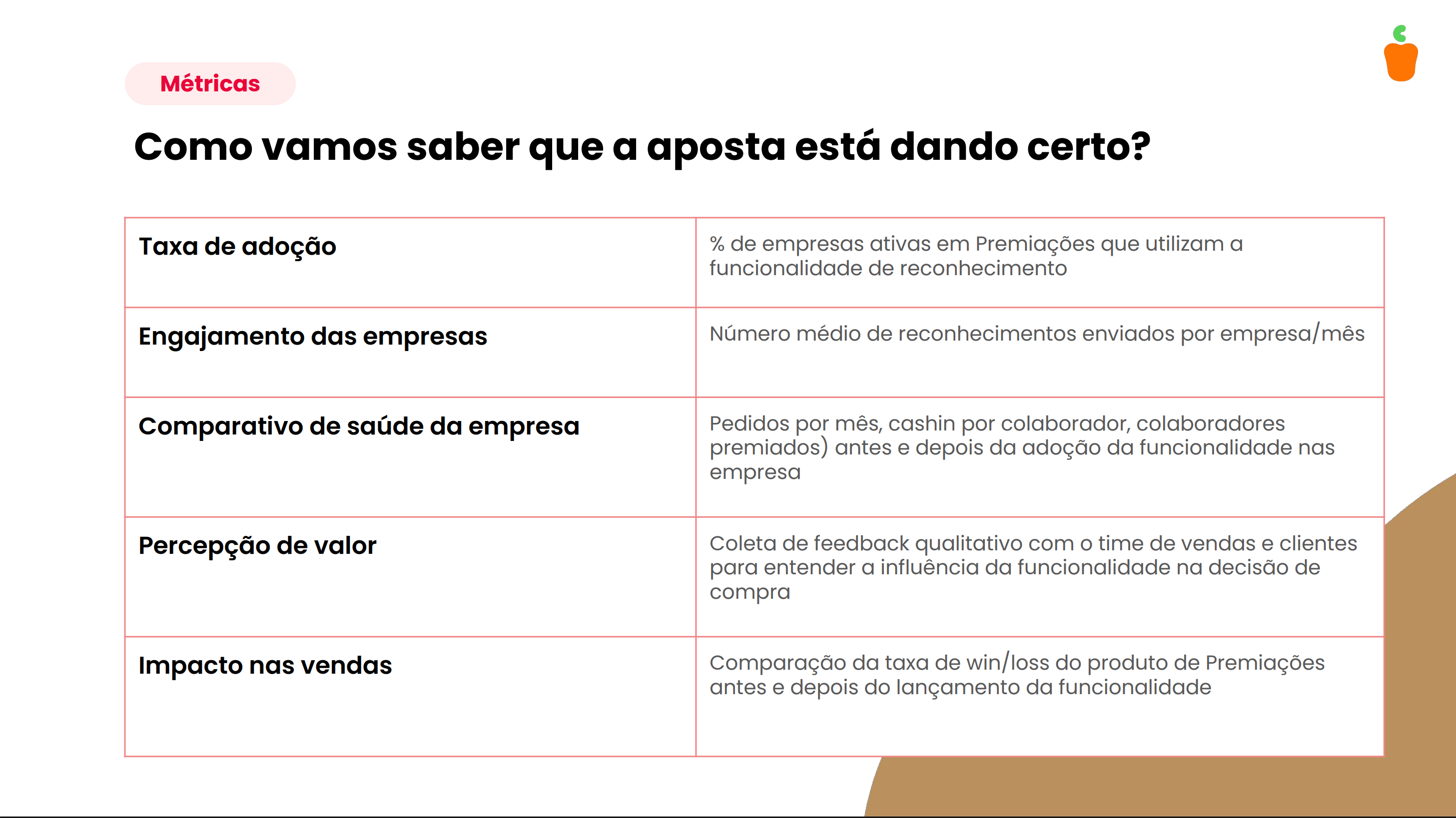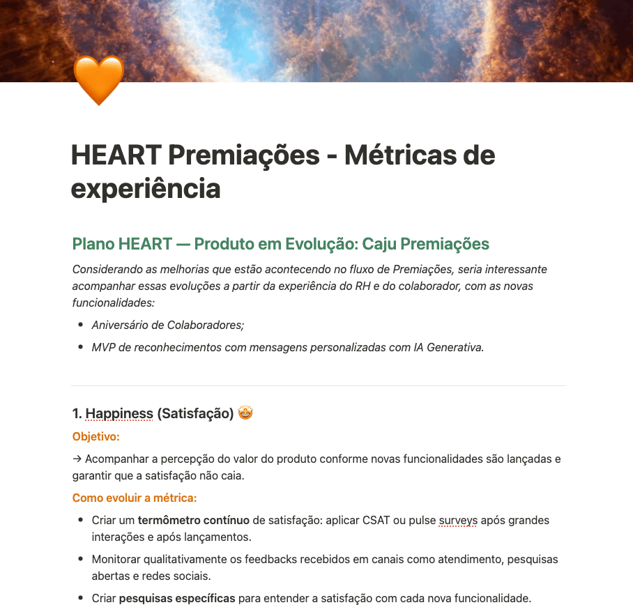 Para validar o sucesso da nova funcionalidade de reconhecimento com IA, estruturei um plano de métricas baseado no framework HEART, focando inicialmente no pilar de Happiness (Satisfação) para monitorar a percepção de valor através de CSAT e pesquisas qualitativas. Além da satisfação, a estratégia de acompanhamento inclui indicadores quantitativos de negócio, como a taxa de adoção por empresas ativas, o engajamento através do volume de reconhecimentos enviados e o impacto nas vendas, comparando as taxas de conversão (win/loss) antes e depois do lançamento da ferramenta. Essa abordagem holística permite entender não apenas se a IA está sendo utilizada, mas como ela contribui para a saúde financeira e a retenção dentro do ecossistema Caju.