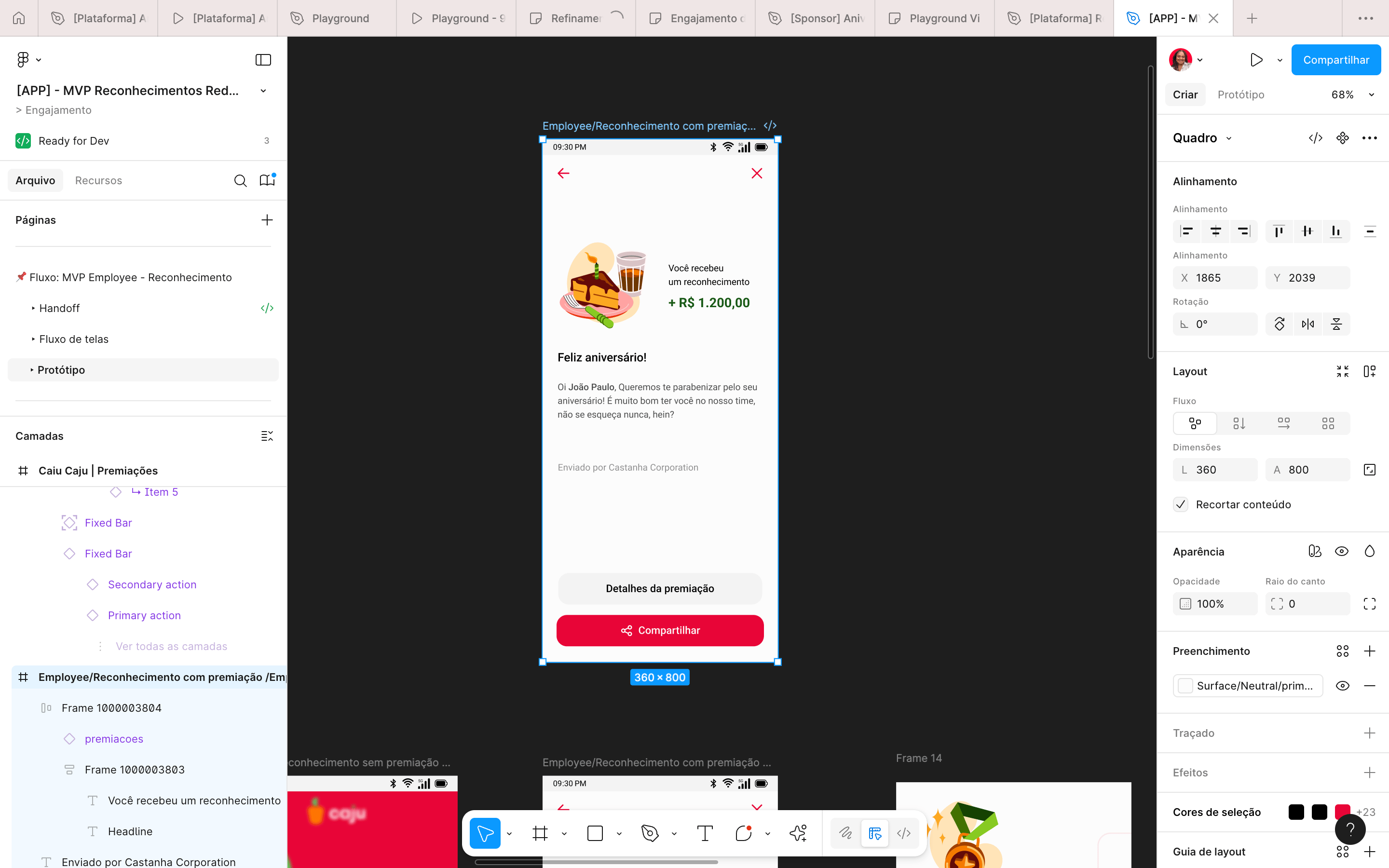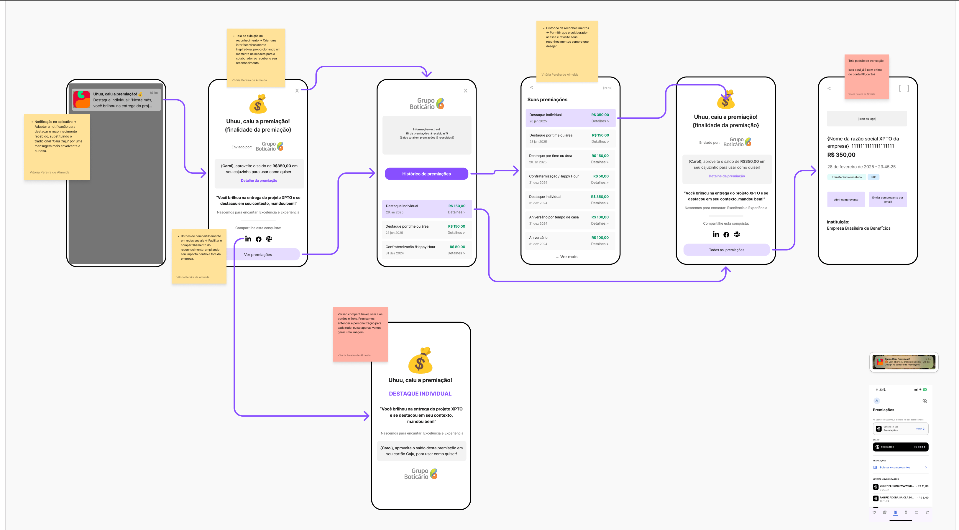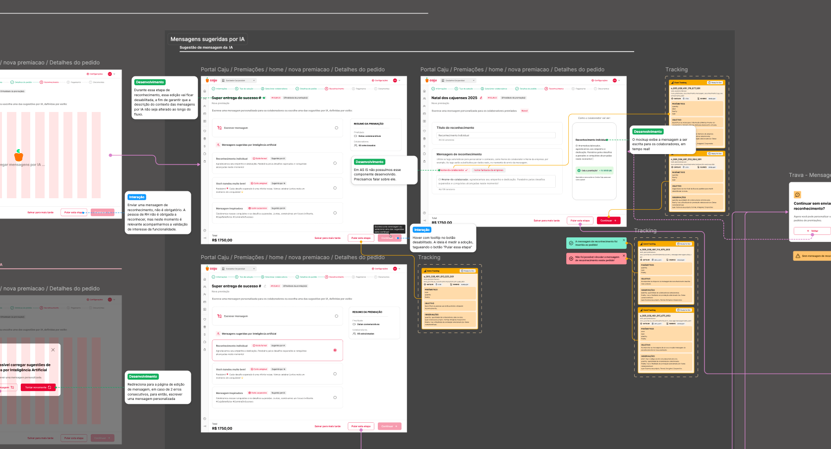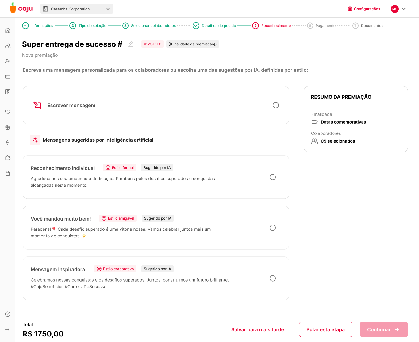 Mais do que uma transferência de saldo, queríamos que o colaborador sentisse o impacto real do seu esforço. No revamp do Caju Premiações, introduzimos a camada de reconhecimento humanizado. O objetivo foi claro: garantir que o dinheiro no cartão fosse interpretado não como um bônus genérico, mas como um agradecimento genuíno pelo seu trabalho.